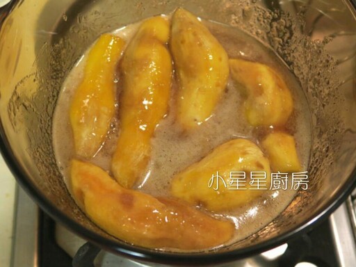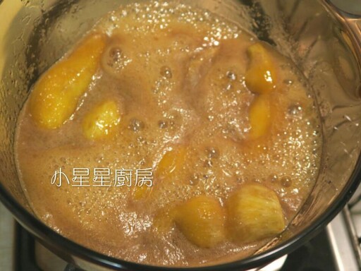 步驟 5:然後把地瓜放進去,用小火煮5分鐘,邊煮邊留意不要燒焦。