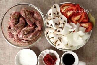 步驟 1:備好所有食材。牛肋條先切除肉上過多白色油脂,再切成4-5公分段長,並均勻撒上牛肉醃料,冷藏醃製30分鐘入味。牛番茄每顆均切四大塊,洋蔥切丁。洋菇大朵切4瓣,小朵不切。