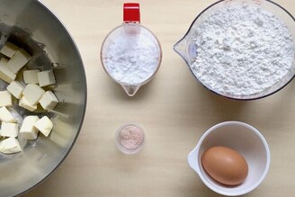 步驟 1:首先製作餅乾麵團,無鹽奶油和蛋都要事先退冰至室溫,將麵粉和糖粉(包含糖霜要用的)分別過篩1次。