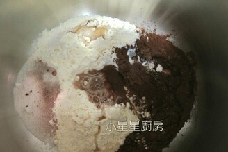 步驟 1:所有材料都放進攪拌盆,水不要一次全部倒完,先留一些,之後視麵團吸水情況再慢慢加入。油量多寡會影響軟硬度,我之前做原味貝果時,試過加5g油和不加油,所以這次做巧克力口味,我想實驗把油加到10g,看看口感變化。