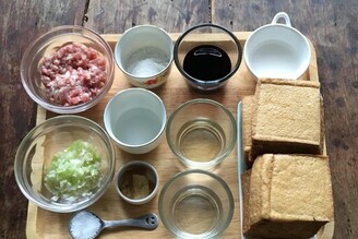雖已過了小滿,卻是梅雨不來,陽光依舊露出金燦燦的淺笑,溫柔的日光映照下,貓兒們曬得靜暖。想作一道樸實的絞肉料理,可以同時滿足愛吃豆腐的我,與愛食葷的阿貓,將油豆腐橫剖切開一個口袋狀的裂口,再將調味過的絞肉填入其中,甜鹹醬汁燒至入味,不同於傳統冰糖醬方以整塊五花肉滷蒸,不敢食肥油的朋友也能安心享用,醇厚的風味,一如山城裡的晨昏,柔軟溫潤。