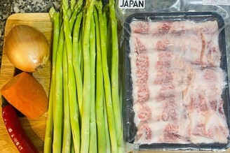 利用肥牛的油脂,快炒蘆筍和配料,重點在蘆筍的處理,只要這樣做,蘆筍嫩脆鮮甜,非常美味。