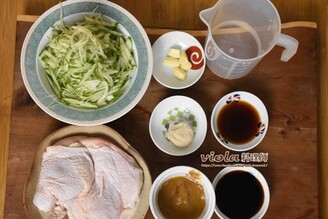 步驟 1:準備食材小黃瓜切絲。去骨雞腿可撒上少許鹽幫助入味