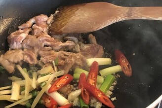 步驟 1:先將金針花簡單清洗後浸泡熱水3分鐘,撈起瀝乾水分備用。熱鍋,將肉絲煎至表面變色,下薑絲蔥段辣椒片爆香。