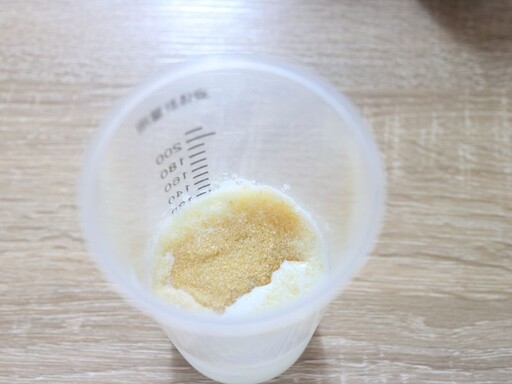 步驟 4:將吉利丁粉泡入牛奶中,邊灑邊攪拌一下,其實也是會吸收牛奶水分,只是速度會比用水稍慢些。