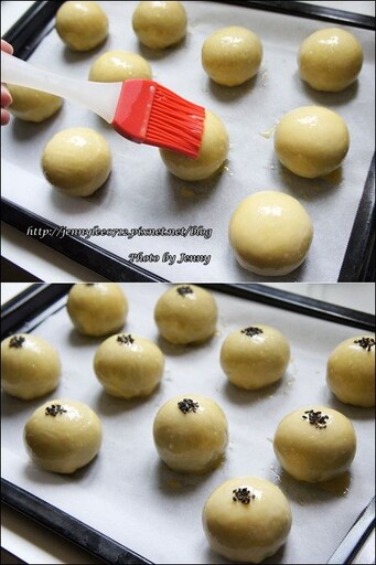 步驟 11:整型後,收口朝下排入烤盤中,表面刷上蛋黃液,再撒上黑芝麻。