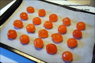 步驟 1:鹹蛋黃排入烤盤中,噴上米酒去腥,再放入烤箱以150烤約10分鐘,取出冷卻。