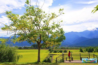 ▲無意間發現的賞景平台,一側便是長的高大的阿勃勒,一旁便是灑落一地金黃的稻田,無法用言語形容的優雅之美。