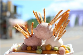 ▲江記舊記傳承爸爸的做芋冰手藝,兒子發揮創意將芋冰做成義式口味,這道草船借箭創意冰品更是酷呆了,底部鋪的是芋頭蛋捲,上面鋪了麥芽夾心酥、各種口味的芋圓,再加上冰淇淋及芋酥條,從頭到尾的所有食材都是江記舊記自己製作的唷。