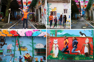逗趣好玩的高雄甲仙貓巷,徜徉葡萄牙阿格達城的繽紛七彩雨傘巷弄,跟貓咪玩跳繩、跟招財貓拔河、假仙在站牌等公車,尋找俏皮可愛的貓郵筒唷,遊客來到甲仙,不外乎就是吃吃芋冰品嚐芋粿,然後可能就離開了,但甲仙超多好玩的點,像是好好咖啡、小林國小、彩色教堂等,景點串連起來玩上一天都沒問題,這條貓巷更是隱藏版裡的隱藏版,當時是為了2015年9月的甲仙芋筍節而進行街道彩繪,這條巷子也很有趣,目測大概100公尺,聽居民閒聊時才知道,以前沒有操場,就會在這裡比賽跑步,常常也會有貓咪走動,因此才誕生了以貓咪為主題的彩繪,老師貓、郵差貓、土水貓、啦啦貓、考古貓、掛筍貓、採芋貓等,都是跟甲仙產業息息相關的貓咪,貓巷上方掛了好幾百把的雨傘,把天空點綴成炫麗的彩虹色澤,像極了葡萄牙阿格達城裡的雨傘裝置藝術,這條隱身甲仙郵局旁的貓巷,真的很有趣唷,絕對讓你逛到賴著不肯離開甲仙啦,幸運的話還會在貓巷遇見炸芋餅的盛況唷。