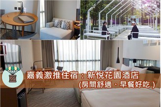 ❤️[嘉義]嘉義住宿激推-新悅花園酒店,房間舒適、早餐好吃、免費高鐵接駁! 2021-04-05 # 阿里山 # 雲林 # 故宮 # 健身 # 開箱 # 下雨天 # 酒店 # 飯店 # 咖啡 # 早餐 # 零食 # 免費 # 冬 # 便利商店 # 缺點 # 推薦 # 夜市 # 遊戲 我好像幾乎沒有去嘉義住過飯店,這一次阿香突然很想去北港(雲林和嘉義的交界),我老爹也有順道回嘉義故鄉看看,所以就很很臨時決定來趟小旅遊。 南部的冬日天氣很好,因為故宮南院就在嘉義高鐵站附近,錯過覺得太可惜,所以一大早抵達嘉義後,我們先去了故宮,再前往北港朝聖! 最後入住嘉義評價超高的「新悅花園酒店(看房價)」,覺得很值得推薦! 一開始我因為地點的關係有點猶豫(在嘉北站附近),後來後來看到飯店免費的高鐵接送(要預約,也有市區內的接駁),就覺得這太划算了(嘉義市區離高鐵蠻遠的)。 加上帶爸媽出遊,大都也靠計程車移動,所以其實是不是住離市中心那麼近好像也不是重點了! 總之,新悅花園酒店服務好、房間乾淨、早餐好吃,如有帶小朋友的家庭也很適合(有滑草、小賽車和兒童遊戲區)。 先來簡單的瀏覽一下前面的旅程吧!從嘉義高鐵站到故宮南院只有5分鐘阿,有免費的接駁車可以搭,先看好車次,其實很方便喔!! 從故宮南院也有到北港的接駁車,但如果趕不上也可搭計程車,輕鬆抵達。 北港除了拜拜以外,對阿香來說還很好買,從蒜頭...到麻油,買不完! 結束了一天的旅程,我們從北港來到新悅花園酒店(看房價),本來已經查好客運班次,要從北港慢慢逛回飯店附近的站。 但後來好險沒有這樣做,因為阿香採購了很多東西,從客運站牌走到飯店,拿著東西其實走蠻遠的~跟老人家出門還是乖乖搭計程車吧! 新悅花園酒店(看房價)的幾點在嘉北站附近,其實搭計程車到市區也10分鐘車程,飯店也有提供定點的接駁車,如果善用的話其實超級超值!! 飯店的外觀很像是一般大樓建案,沒有太華麗,但是附近很寬敞,一入門就可以感受到親切貼心的服務。 門口有一個旋轉木馬,很多若要坐的話,要跟服務人員說。 而且這裡也是可以辦小型戶外婚禮的場地喔,在飯店的花園有個小小的白色場地,早上拍照起來蠻美的(由阿香和阿堂示範一下)。 新悅花園酒店(看房價)的大廳走簡單明亮路線,唯一的缺點就是可以舒服坐著的椅子太少了。 大廳旁有一個簡單的lounge bar~ 來開箱看一下房間吧!我是訂精緻家庭房,有兩張雙人床(看房價)。 房內也有椅子、沙發可以休息。 茶包咖啡給的很大氣~ 我們訂的房型沒有浴缸,但住一晚還可接受。 洗手台是開放模式,可能為了加大房內的空間所以這樣設計。 飯店周圍沒什麼遮蔽,所以每間房應該視野都不錯(看房價)。 我們剛好可以看到底下的小型賽車場。 覺得這個枕頭的花色蠻美的,床頭也放了一塊有阿里山風情的木頭。 check in時會發賽車券,帶小孩同行的人可以去玩一下。 也有個小小的滑草場,適合小朋友。 下雨天的話則有室內的遊戲室,遊戲室外有家長可以坐的沙發區(還有提供咖啡、茶水)。 因為飯店旁邊並無便利商店等,所以飯店有販賣機,有賣飲料、零食、泡麵,洗衣機、烘乾機也有。(看房價) 也有健身房。 介紹完房間和公設,來看看早餐吧!本來對於早餐沒有特別期待,但前一個晚上在夜市吃到太多雷的食物,所以覺得飯店早餐太好吃了XD 新悅花園酒店(看房價)的早餐不是走豪華等級的,但是懂煮的人一吃就了解,廚師是有一些功夫的,光是炒青菜、炒麵就覺得厲害,而且食物熱騰騰一直上,直到用餐快結束還是不停補食物。 沙拉新鮮好吃~ 豆花也好好吃耶~~ 飯店越住越多後,發現有一些豪華飯店只是超會擺盤、食物很多元,但其實不好吃。 但是新悅花園酒店(看房價)的食物雖然種類不多,但是幾乎樣樣都很美味,這是蠻難得的現象!! 總之,愉快的嘉義之旅結束啦!之後來嘉義可能還會住這家耶~