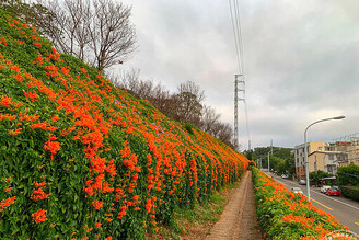 公園處黃淑如處長表示炮杖花是春日最應景的植物花期約為每年2月中旬至3月上旬花博圓山園區的炮仗花步道屬秘境等級綿長的花串美不勝收盡收眼前的美景會讓人忘卻時間的流逝讓人捨不得移開腳步纍纍花苞目前正陸續綻放中攀爬的炮仗花在廊道頂端傾瀉而下連串的花束宛若橘黃色瀑布花海尤其目前正值臺北玫瑰展期間可順遊新生公園的臺北玫瑰園來個一日雙花遊