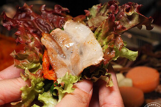 韓國料理講求黑白紅青黃五方色與七彩裝點,這一間烤肉店蜜豬屋(꿀돼지집)也將韓國傳統的料理方式端上桌,其中最出彩就是那一盤五彩繽紛的蔬菜盤,菜盤下,為韓國傳統螺鈿托盤;菜盤中,擺列著辛奇(kimchi)、蛋黃辛奇、蕨菜、韭菜、辣豆芽、大蒜等各式各樣搭配烤肉的配菜,而且還能將這些配菜與烤肉肉片一起放在烤盤中,生菜包肉完成後一入口,就能感受到韓式生菜包肉的精彩好味!
