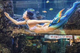 大葉高島屋推出週年慶限定水族話劇秀與美人魚餵魚秀,吸引滿場人潮