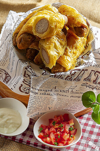 酥皮小熱狗將鹹香迷你熱狗包入金黃酥皮中,一口一個酥脆可口,是派對聚餐的人氣小點。台北凱撒大飯店提供