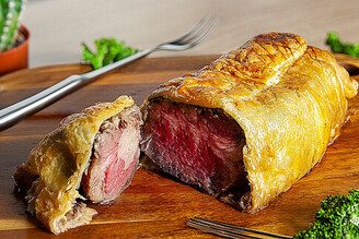 威靈頓牛排因饕客強烈敲碗回歸,酥皮包裹粉嫩牛排,一刀切開香氣四溢,是節慶餐桌上最具儀式感的經典菜色。台北凱撒大飯店提供