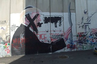 川普Trump才剛宣佈承認Jerusalem為以色列首都~~巴勒斯坦的隔離圍牆上馬上就有諷刺Trump的塗鴉